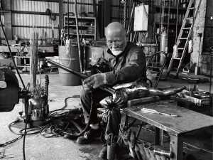 最初は木彫に取り組んだが、後に金属溶接を学び、様々な金属素材による造形を試行錯誤し、